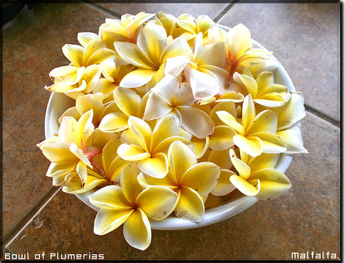 Bowl Of Plumerias- Big Island Of Hawaii by Malfalfa ahh yes- beautiful delicious plumerias These were actually for a lei making class done by Mahina....down on Napoopoo Rd on Big Island Hawaii